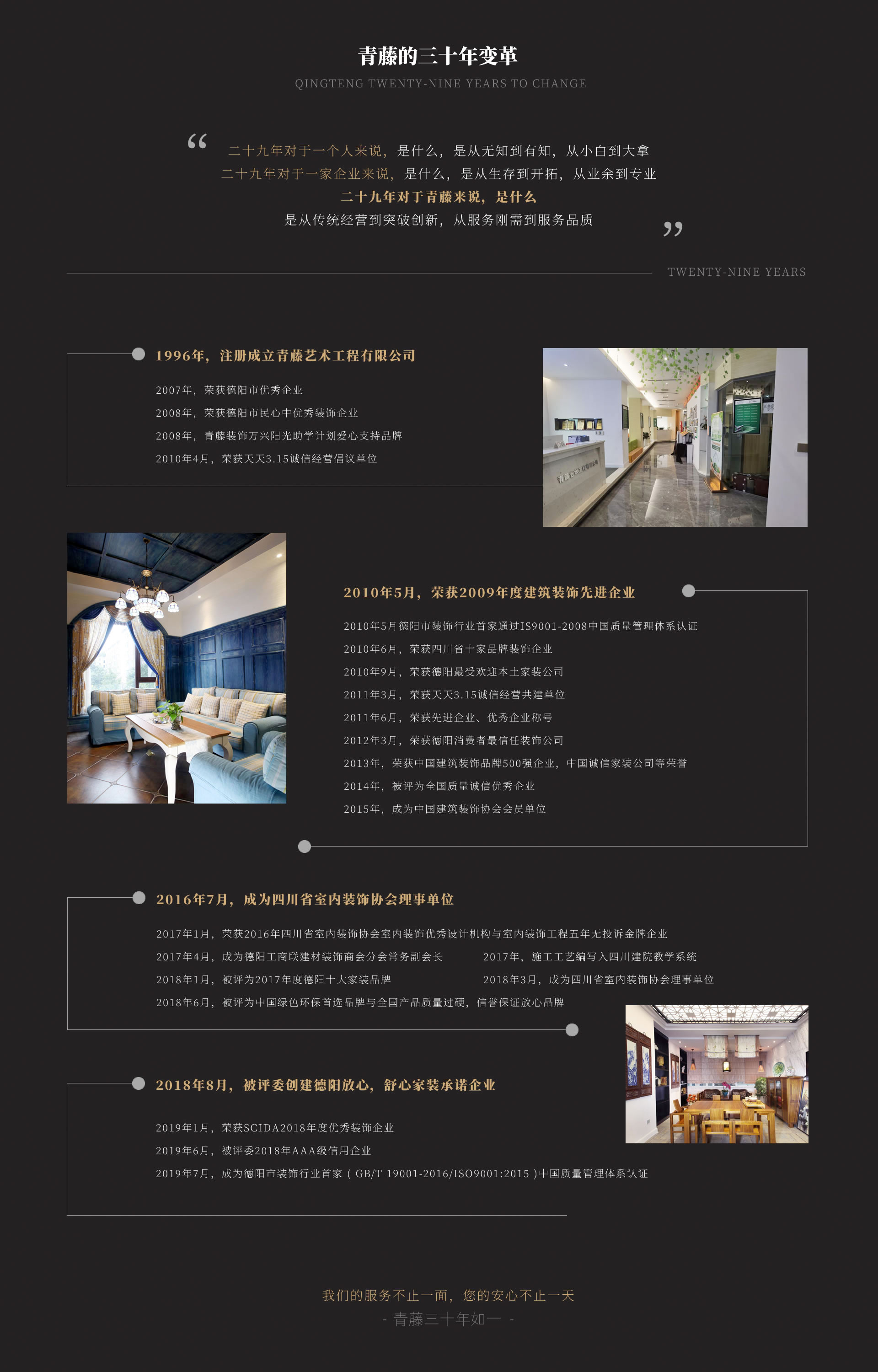 始終提倡“品質(zhì)、創(chuàng)新、服務(wù);競爭、溝通、執(zhí)行”的管理理念以及“誠信為本,打造專業(yè)家裝服務(wù)體系”的企業(yè)經(jīng)營思路。